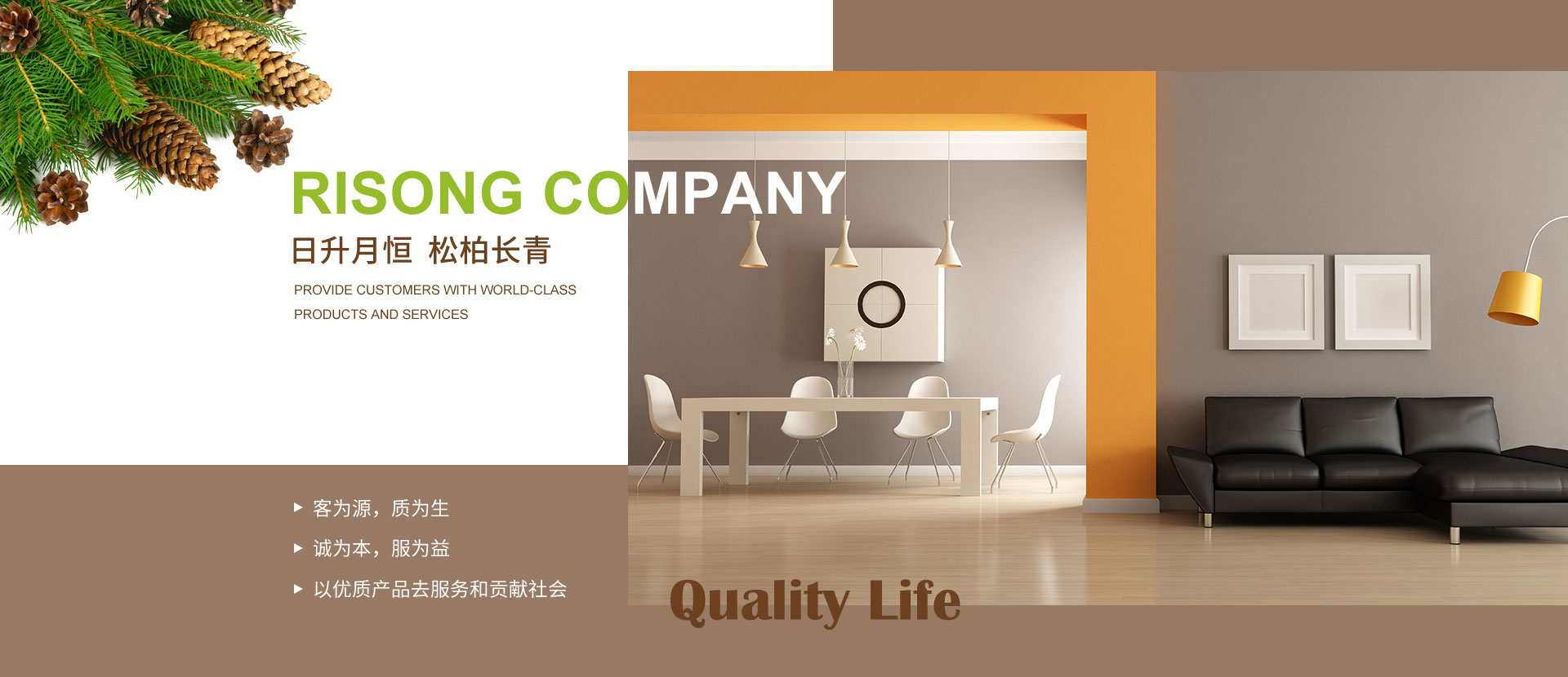大連日松將一直秉承“以優(yōu)質(zhì)產(chǎn)品去服務(wù)和貢獻(xiàn)社會(huì)”的經(jīng)營宗旨;“客為源,質(zhì)為生、誠為本、服為益”的經(jīng)營理念;達(dá)到“使用者、銷售者、制造者”三者并存共榮之經(jīng)營思路;全體日松人將以“熱情、禮貌、快捷、準(zhǔn)確”的行動(dòng)指南,不懈努力的為每一位客戶,提供行業(yè)內(nèi)一流的高端、環(huán)保、舒適、健康的產(chǎn)品和細(xì)節(jié)服務(wù),打造出適合“您”的優(yōu)質(zhì)家居住宅環(huán)境。